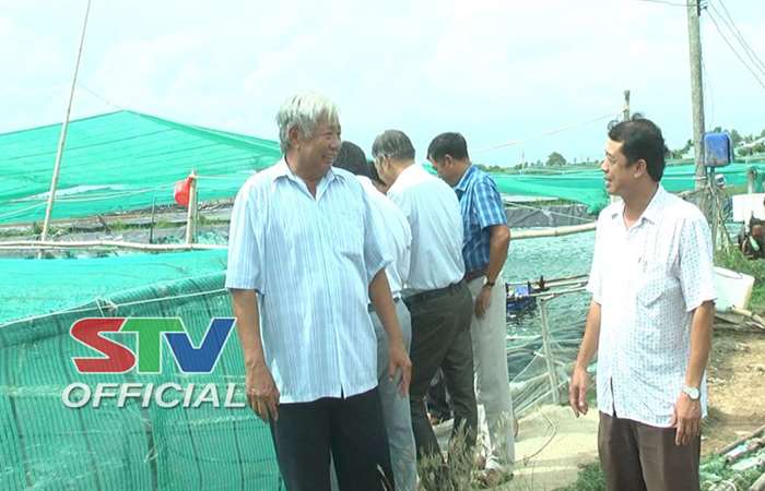 | Lãnh đạo Thị ủy Vĩnh Châu kiểm tra tình hình nuôi tôm trên địa bàn. |