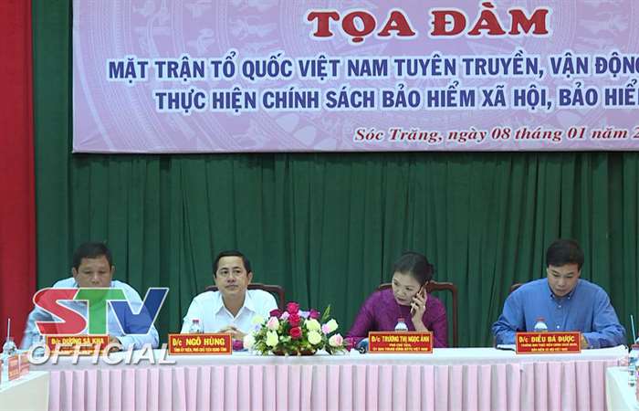 Sáng ngày 8/1, Ban Thường trực Ủy ban Trung ương MTTQ Việt Nam phối hợp BHXH Việt Nam tổ chức Tọa đàm với chủ đề MTTQ Việt Nam tuyên truyền, vận động nhân dân thực hiện chính sách BHXH, BHYT trên địa bàn tỉnh Sóc Trăng. Dự buổi Tọa đàm có bà Trương Thị Ngọc Ánh, Phó Chủ tịch Ủy ban Trung ương MTTQ Việt Nam; ông Điều Bá Được, Trưởng Ban thực hiện chính sách BHXH, BHXH Việt Nam; ông Dương Sà Kha, Chủ tịch Ủy ban MTTQ Việt Nam tỉnh Sóc Trăng; ông Ngô Hùng, Phó Chủ tịch UBND tỉnh.