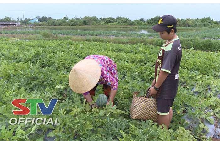 Nông dân trồng màu ven biển của xã Trung Bình, huyện Trần Đề, đang khẩn trương thu hoạch dưa hấu, hành tím, nhằm giảm thiệt hại do mưa bão.