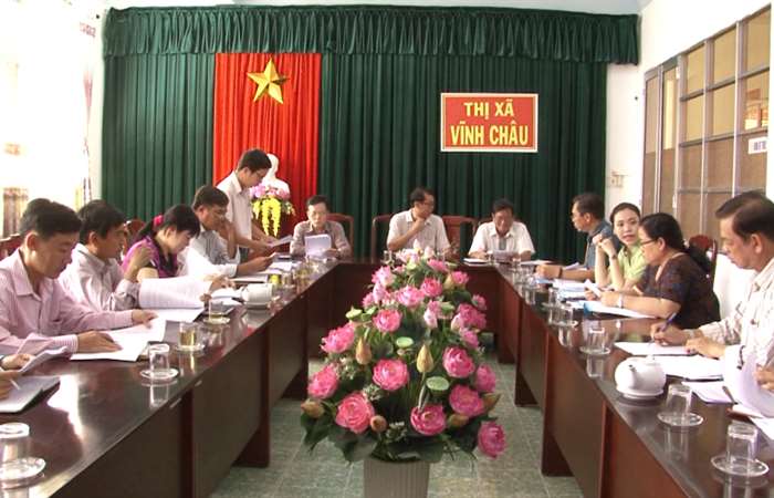 | Đoàn giám sát Ban Kinh tế - Ngân sách HĐND tỉnh làm việc tại thị xã Vĩnh Châu. |