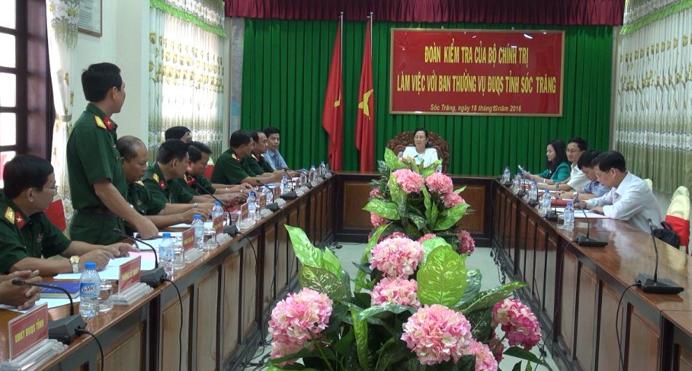 Chiều ngày 18/10, đoàn kiểm tra của Bộ Chính trị do đồng chí Lê Thị Thuỷ, Uỷ viên BCH Trung ương Đảng, Phó Chủ nhiệm Uỷ ban Kiểm tra Trung ương làm phó trưởng đoàn, đã có buổi làm việc tại Đảng uỷ Quân sự tỉnh Sóc Trăng về công tác lãnh đạo, chỉ đạo nghiên cứu, quán triệt, cụ thể hoá Nghị quyết Đại hội XII của Đảng, gắn với tiếp tục thực hiện Nghị quyết Trương ương 4 (khoá XI) “Một số vấn đề cấp bách về xây dựng Đảng hiện nay” và Chỉ thị số 05 của Bộ Chính trị về đẩy mạnh học tập và làm theo tư tưởng, đạo đức, phong cách Hồ Chí Minh. Tiếp đoàn có Đại tá Nguyễn Văn Thống, Chỉ huy trưởng Bộ Chỉ huy Quân sự tỉnh; đồng chí Nguyễn Văn Thống, Phó Chủ nhiệm Uỷ ban Kiểm tra Tỉnh ủy; Đại tá Trần Văn Lâu, Chính uỷ Bộ Chỉ huy Quân sự tỉnh cùng các đồng chí trong Đảng ủy quân sự tỉnh.