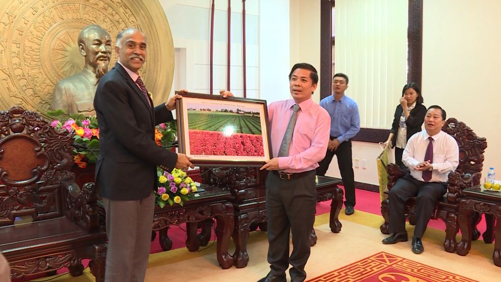 Bí thư Tỉnh ủy Sóc Trăng (bìa phải) tặng quà lưu niệm cho Đại sứ đặc mệnh toàn quyền Ấn Độ