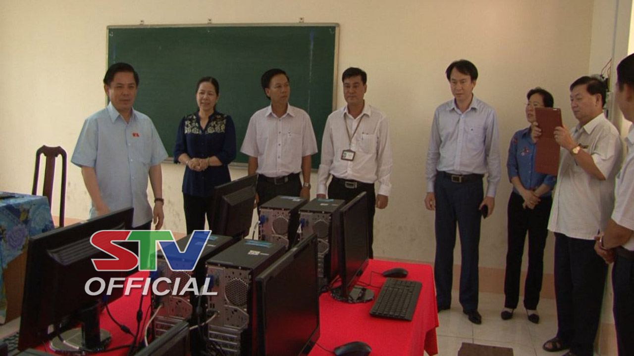 Bộ trưởng Giao thông vận tải Nguyễn Văn Thể ( bìa trái) tặng 15 bộ máy tình cho trường THCS Lâm Kiết, huyện Thạnh Trị.