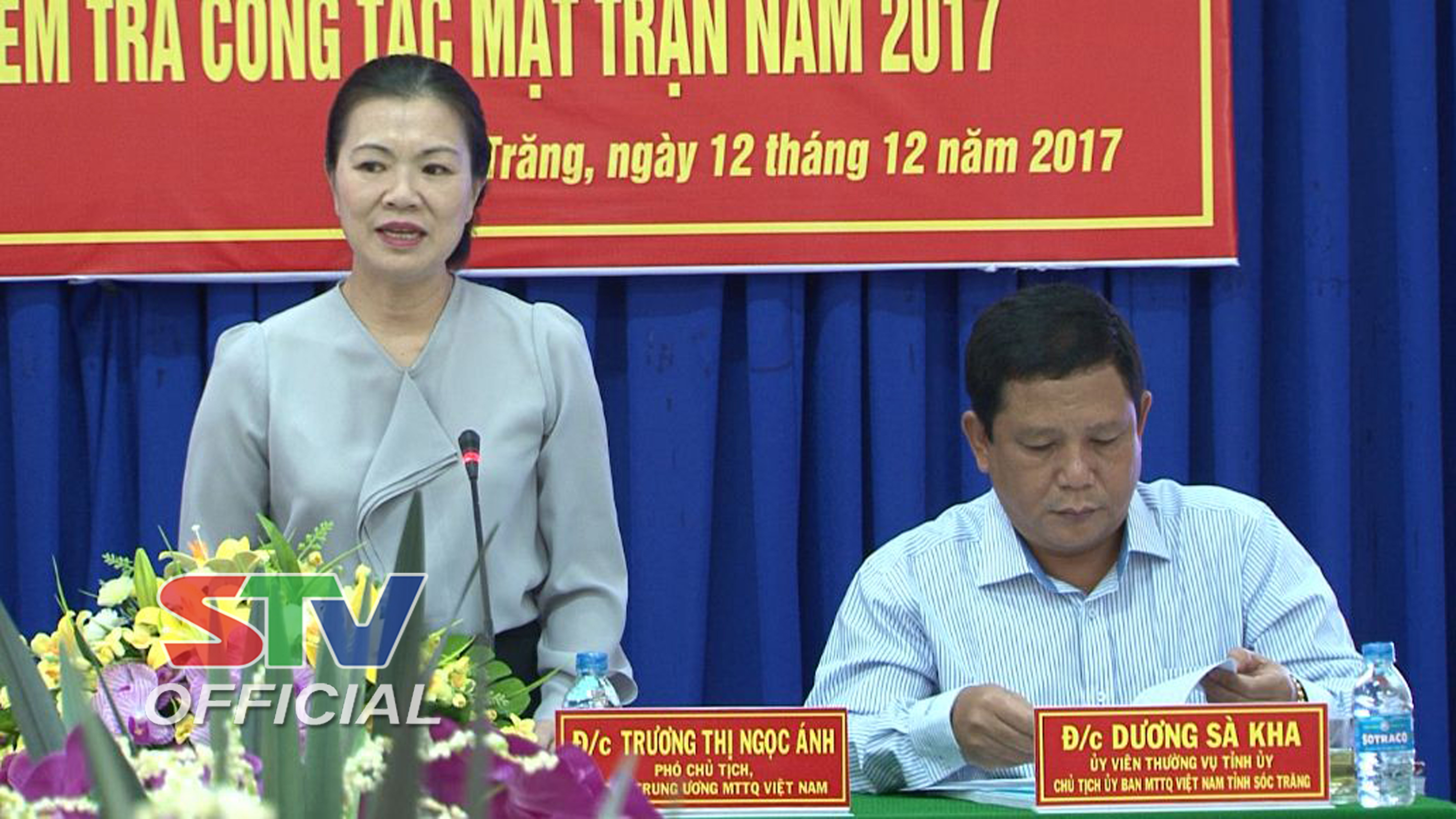 Chiều ngày 12/12, đoàn công tác của Ủy ban Trung ương MTTQ Việt Nam do bà Trương Thị Ngọc Ánh, Phó Chủ tịch Ủy ban Trung ương MTTQ Việt Nam làm trưởng đoàn, đã đến kiểm tra công tác mặt trận năm 2017 tại tỉnh Sóc Trăng.