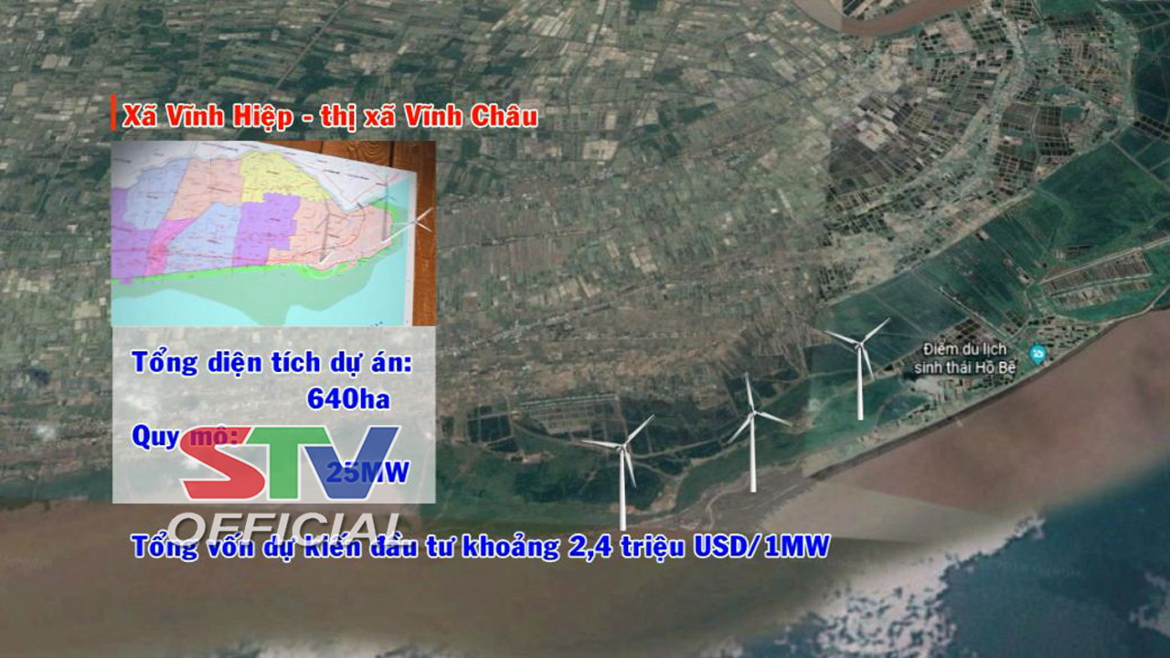 Cũng ở khu vực bãi bồi ven biển, Dự án nhà máy điện gió số 12 trên địa bàn xã Vĩnh Hiệp, thị xã Vĩnh Châu, có tổng diện tích khảo sát 640 ha, quy mô công suất 25 MW. Tổng vốn dự kiến đầu tư khoảng 2,4 triệu USD/MW. Dự án nằm gần khu vực đất liền, có hệ thống lưới điện Quốc gia 110 KV dễ dàng cho việc đấu nối khi vận hành phát điện.