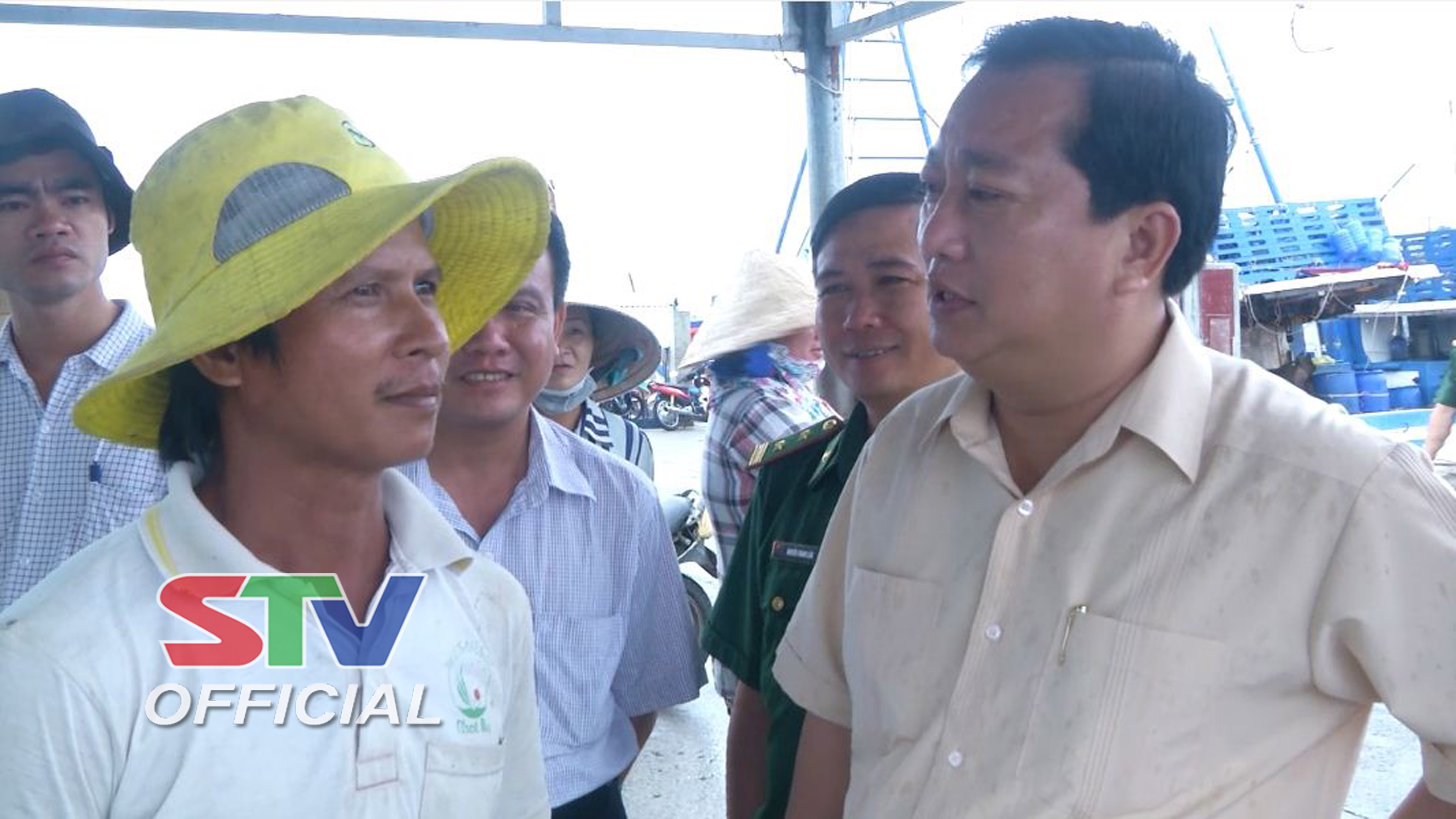 Chủ tịch UBND tỉnh Sóc Trăng ông Trần Văn Chuyện (bìa phải) thăm hỏi ngư dân