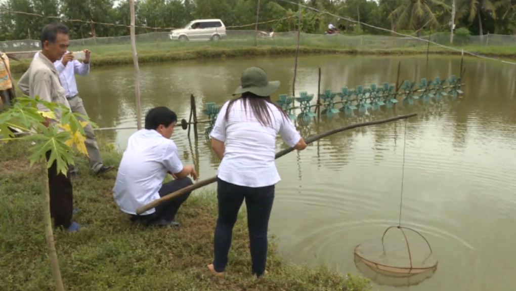 Doanh nghiệp và cán bộ kỹ thuật khảo sát ao nuôi của hộ dân.