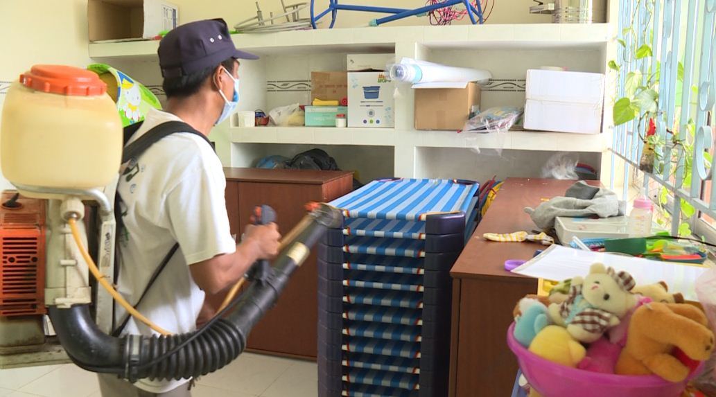 Phun hóa chất diệt muỗi và côn trùng ở lớp học mẫu giáo.