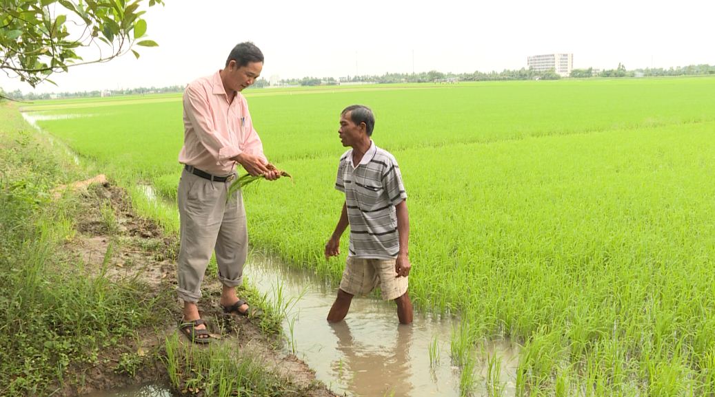 Hướng dẫn nông dân kiểm tra quá trình phát triển giống lúa RVT trên đồng đất thành phố Sóc Trăng.