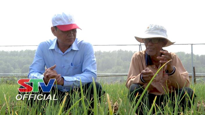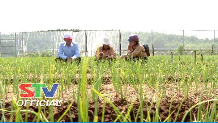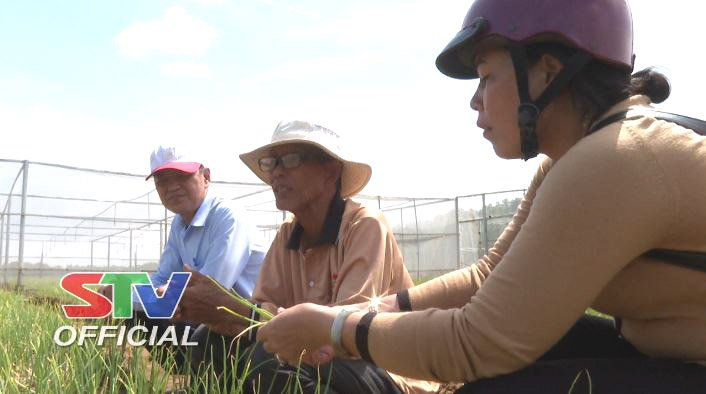 Chị Thạch Thu Hiền (bìa phải ảnh) - Trưởng trạm Trồng trọt và BVTV thị xã Vĩnh Châu hướng dẫn anh Trà Hon ở ấp Âu Thọ A kỹ thuật chăm sóc Hành.